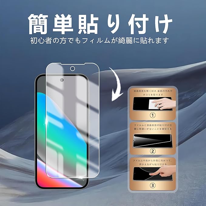 【貼るのが簡単】:貼る位置が確認できれば、指で中央を軽く押すだけで、貼り付けた後も端に気泡が残らず、見た目や触り心地を損なうことなく、きれいに貼ることができます。 (【貼り付け方法】: 1.フィルムを貼る前に、フィルム貼り道具です画面を拭き、指紋や汚れを取り除いてください。 2.フィルム貼付位置に間違いがないことを確認する。液晶に貼った表面を下にしてはがしてください。 3.最後に、ガラス膜を中央から外側に押し込み、気泡が入らないようにする。 )