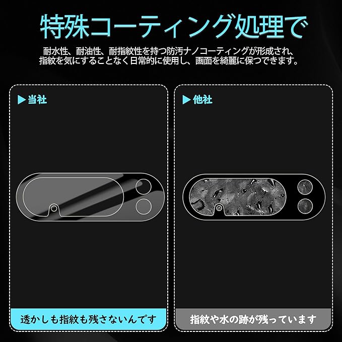 【指紋防止、高感度タッチ】ガラスフィルムには撥油コーティングが施されており、指紋や汚れなどに強くなめらかな操作感を実現、付着した汚れなどは簡単に拭きとれます。こちらは高耐久撥油コーティングが施され、つるつるな滑り感を実現!ゲームしても渋くなし!