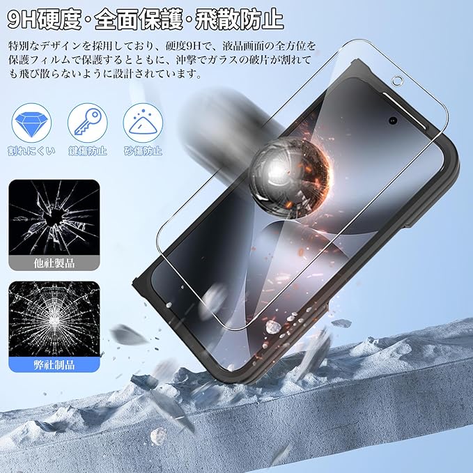 【ガラスフィルム付きの心配りある保護】日本製旭硝子材料を採用し、外部からの沖撃に強く、スマートフォンの画面への沖撃を防ぎます。また、特殊な飛散防止設計により、フィルムが割れても飛散せず、高い安全性を実現しています。スマートフォンを全面的に保護し、液晶画面の安全を守り、長く安心してお使いいただけます。
