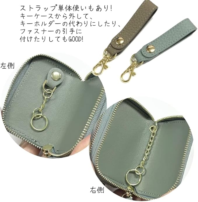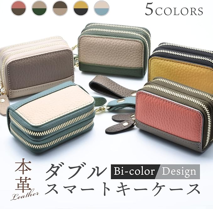 ストラップ付き スマートキーケース 2個収納 レディース 本革 バイカラー ダブル かわいい くすみカラー シボ革 ファスナー スマートキーケース カバー トヨタ
