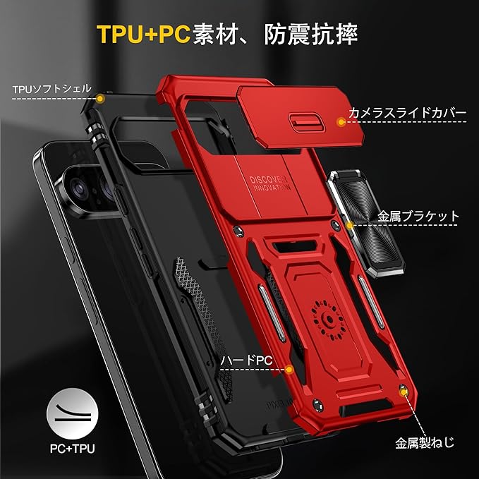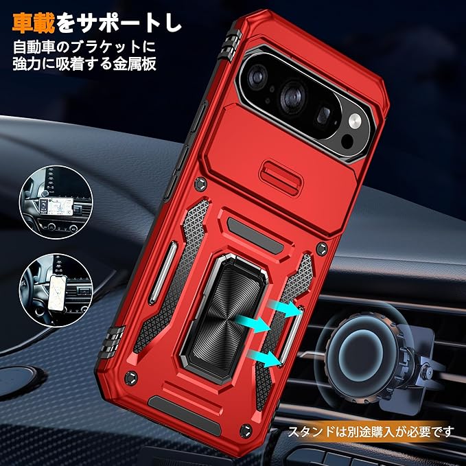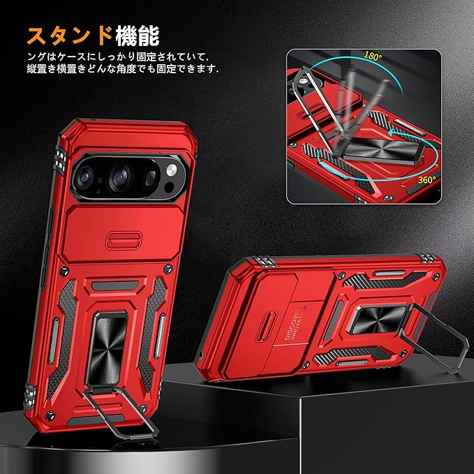 対応 Google Pixel 10 Pro XL 用ケース リング付き スライド式カメラカバー 衝撃吸収 ピクセル 10 プロ XL ケース 耐衝撃 一体型落下防止 スタンド機能 PC+TPU 二重構造 防塵 薄型 軽量 360度回転 保護携帯カバー 赤 MJJ-1064-08-02