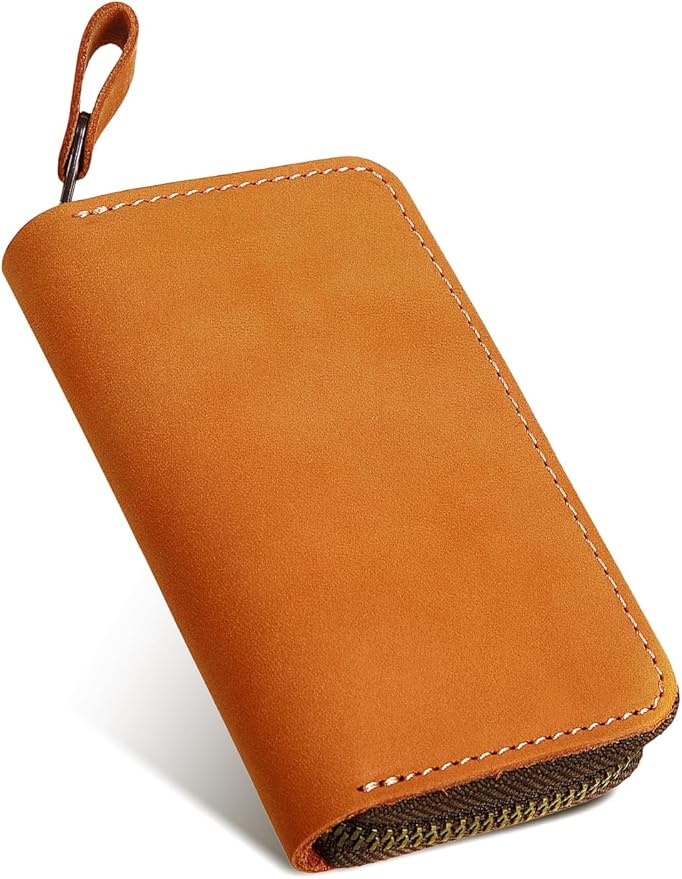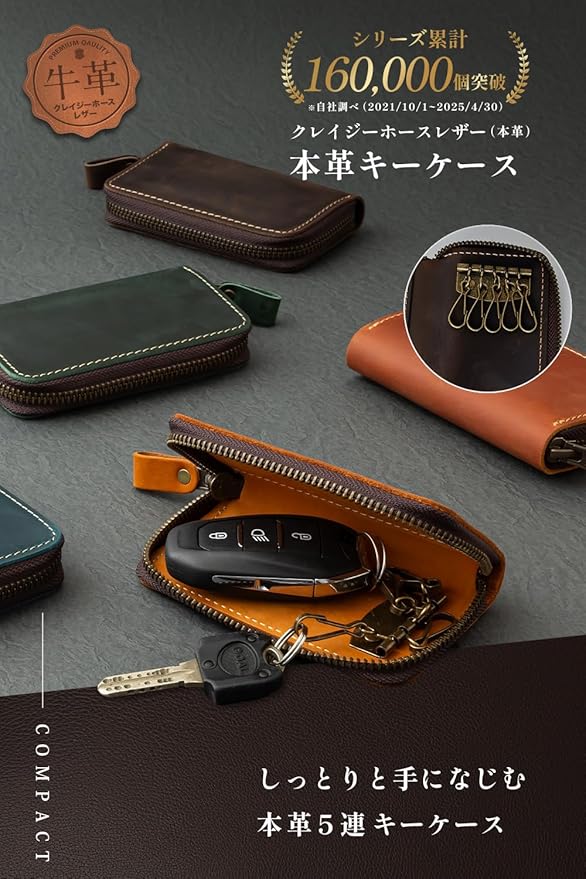【本革クレイジーホースレザー】牛革の最表面の皮を使用したキーケース。牛革の最表面の皮は繊維が細かく、頑丈で耐久性にすぐれています。本革の中でもクレイジーホースレザーと呼ばれる革を使用して作られています。クレイジーホースレザーは品質の良い牛の原皮(馬の皮ではありません)を使用し、植物性タンニンで鞣した皮でしっとりとしたやや起毛したような質感が特徴的なレザーです。当スマートキーケースは起毛加工技術を採用し作られており、手触りが滑らかで耐久性にも優れています。「思わず誰かに見せたくなる」そんな革製品を目指して作りました。