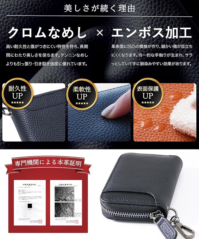 【ながく使える素材】しっとりとなめらかで、手に吸い付くような極上の質感。使うたびにしっくりと馴染み、心地よい手触りを楽しめるのは、上質な本革ならでは。一流ブランドと同等の高品質な牛本革エンボスレザーを惜しみなく使用。細部にまでこだわった丁寧な仕上げにより、美しい風合いと高級感が際立ちます。さらに、耐久性に優れた素材のため、日常使いでも型崩れしにくく、長く綺麗な状態を保つことが可能です。