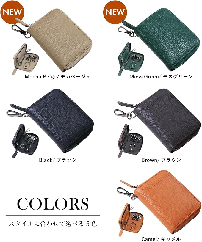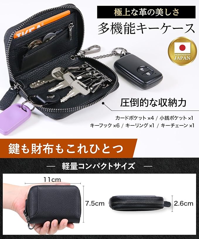 【スペック】サイズ:7.5cm 11cm 2.6cm、重量:112g、素材:牛本革、Made in PRC、キーフック 6、キーリング 6、キーチェーン 1、カードポケット 4、小銭ポケット 1【カラー】ブラック、ブラウン、キャメル