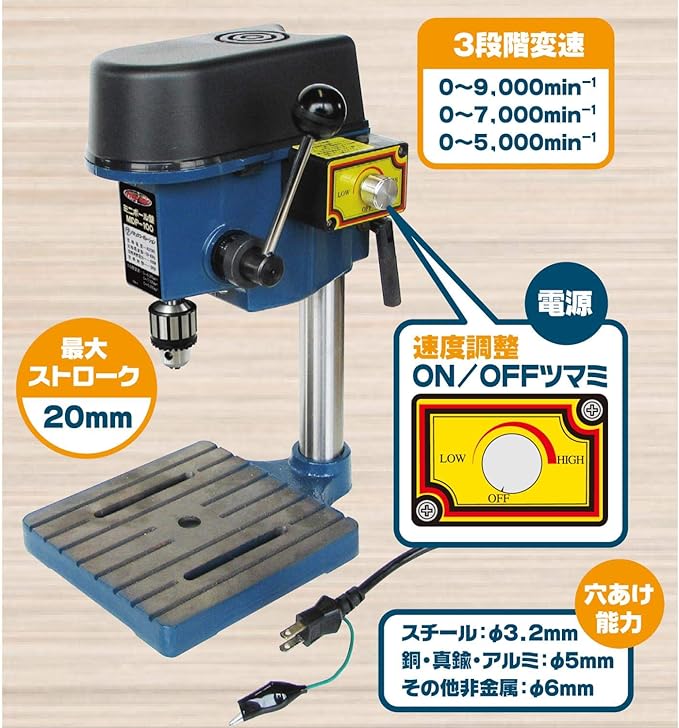軟金属や木材、プラスチックやアクリル等の垂直穴あけ作業に