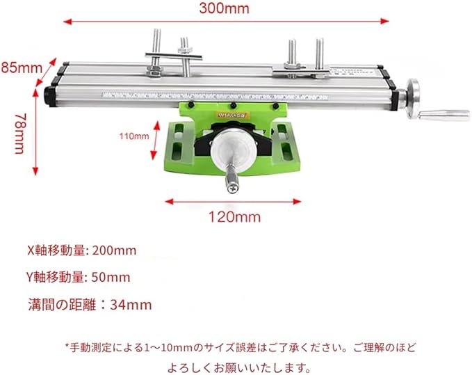 仕様: テーブルサイズ:300 * 85 * 78mm X軸移動量:200mm Y軸移動量:50mm 溝間隔:34mm リング1個あたり:1.25mm スケール1個あたり:0.05mm パッケージ重量:1657g / 3.65lb パッケージサイズ:350 * 200 * 80mm / 13.78 * 7.87 * 3.15in 注:手作業による計測のため、1~10mmの誤差が生じる場合がありますのでご了承ください。 パッケージ内容: ミニ多機能テーブル x 1 アクセサリーセット x 1