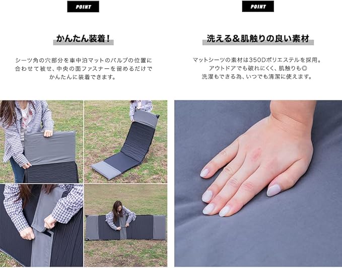 ✅【かんたん装着】 シーツ角の穴部分を車中泊マットのバルブの位置に合わせて被せ、中央の面ファスナーを留めるだけでかんたんに装着できます。 ✅【洗える&肌触りの良い素材】 マットシーツの素材は350Dポリエステルを採用。アウトドアでも破れにくく、肌触りも◎ 洗濯もできる為、いつでも清潔に使えます。