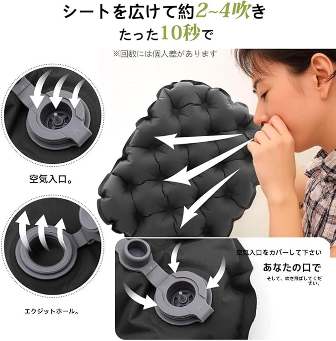 【1~2吹きで瞬時膨らむ快適性】新設計の大口径エアバルブを採用。たった1~2回吹き込むだけで、高さ最大5cmまで調節可能。子どもから大人まで簡単セットでき、長時間の座り心地をしっかりサポート。