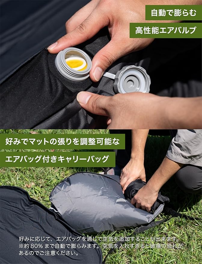 【快適さをさらに向上させるエアバッグ】 エアバッグ付きキャリーバッグを活用し、好みに応じた張り具合を調整可能。自分だけの快適さを実現します。 【サラサラの肌触りで一度使ったら手放せない】 滑らかな質感が肌に優しく、心地よい寝心地を実現。アウトドアでも贅沢なリラックスタイムをお楽しみください。