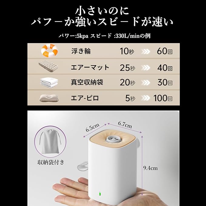 30秒で充填&3000mAhの大容量 :この電動空気入れは3000mAhの大容量バッテリーを搭載しており、別途売り5V2Aアダプターを接続して約2時間でフル充電されます。 フル充電で、浮き輪に40回、ゴムボートやエアーベットに15回、バランスボールに20回、エアピロに100回空気を入れることができます。効率が従来の電動空気入れより8倍も上がり、エアピロを10秒で、305cm 185cm 3.5mmプールを8分で充填できます。旅のお供にもなりますし、運動場にも欠かせない空気入れです。