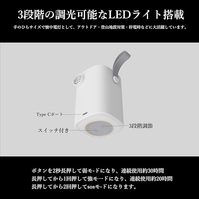 【3段階調整可能なLEDライト機能】 3段階調光可能なLEDライトは、夜のあらゆるシーンに対応します。「弱・強・SOS」の3モードから選べ、キャンプのメイン照明からテント内の間接照明まで使い分けられます。特に緊急時に役立つSOSモード搭載で、アウトドアやキャンプでも安心です。コンパクトながら高輝度で、省電力設計のため長時間使用可能。日常から非常時まで、一台空気入れで多機能なスマートライトです。