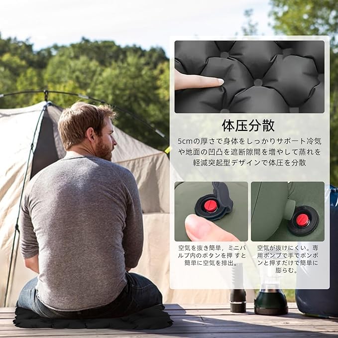 【体圧分散設計】科学的な体圧分散デザインにより、マット上の圧力を均等に分散させ、長時間の座位や寝姿勢でも体の負担を軽減します。特に長時間のキャンプ活動に最適です。