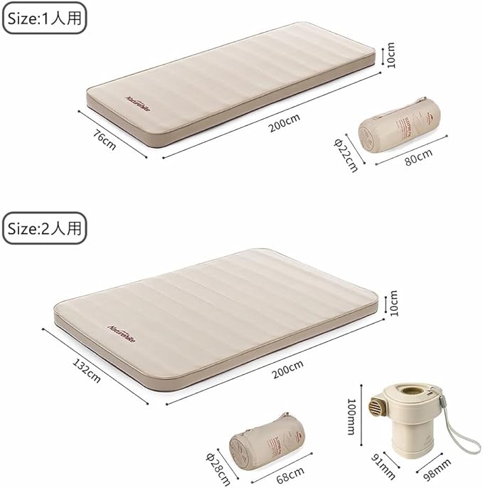 【仕様】本製品は1人用と2人用のバージョンが有り、好きなタイプを選んでください。1人用の使用サイズ:長さ200㎝ 幅76㎝ 厚み10㎝、収納サイズ:直径28㎝ 78㎝、約3.1㎏、材質:30Ⅾ高弾性生地+ポリエステル繊維+スポンジ+オックスフォード生地。2人用の使用サイズ:長さ200㎝ 幅132㎝ 厚み10㎝、収納サイズ:直径38㎝ 68㎝、約5.3㎏、材質:30Ⅾ高弾性生地+ポリエステル繊維+スポンジ+オックスフォード生地。
