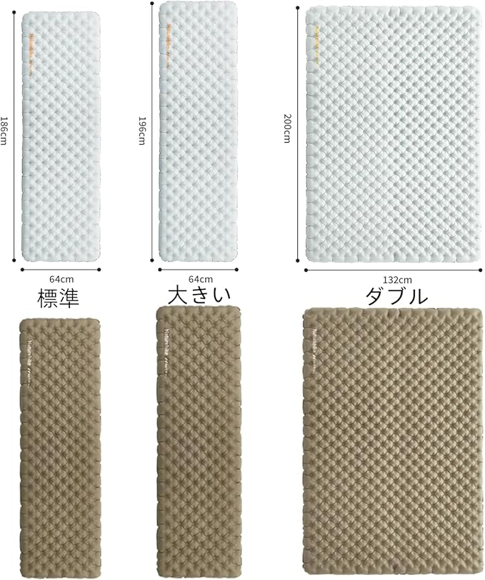 【超軽量・設営簡単・様々なシーンで大活躍】 このマットは超軽量(186x64cm)590g,(196x64cm)690g,(200x132cm)1300gの重さで、コンパクトな収納サイズに加え、ザックの場所を取りません。専用の収納袋が付いているので、収納スペースをとらず、500mlペットボトルより少し大きいくらいの収納サイズ、持ち運びも簡単です。全体的な軽量設計により、旅のプレッシャーが軽減されます。ファミリーキャンプから登山やツーリングキャンプにも非常に適しています。ザックに入るコンパクト&軽量なエアーマットの登場です。さらに、室内で使用しても違和感はありません。家には来客時の一時的なマットレスとしても最適です。
