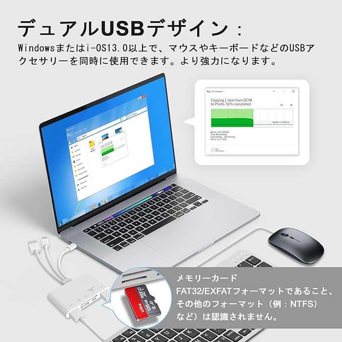 高速な転送速度:SD カードリーダーの高速な二方向転送は、待機時間を短縮することができます.Phone/Pad/Android/Computer と他のデバイス之间的データ管理が簡単に行えるようにします。