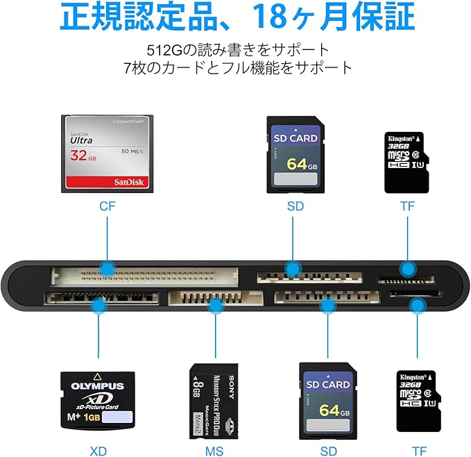 ✅【7-in-1カードリーダー】2*SDポート(SD /SDHC/SDXC/MMC/RS-MMC) + 2*TFポート(Micro SD/Micro SDHC/Micro SDXC)+1*CFポート+ 1*XDポート+1*MSポートが装備されています。このメモリーカードリーダーを使えば、5種類のカードに高速でアクセスでき、1台で市販の主要なメモリーカードに対応するため、メモリー容量を気にすることなく、いつでもどこでも写真やビデオを共有できます。