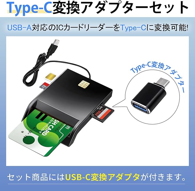 【2025最新型】icカードリーダー マイナンバーカード対応 USB-A&Type-C 接触型 sdカードリーダー 設置不要 自宅で確定申告 国税電子申告 納税システム e-Tax対応マイナンバーカード ICチップ付いた住民基本台帳カード SDカード/マイナンバーカード/キャッシュカード その他対応 Windows11/10/8/7/Vista/macOS 10.16以降 日本語説明書付き