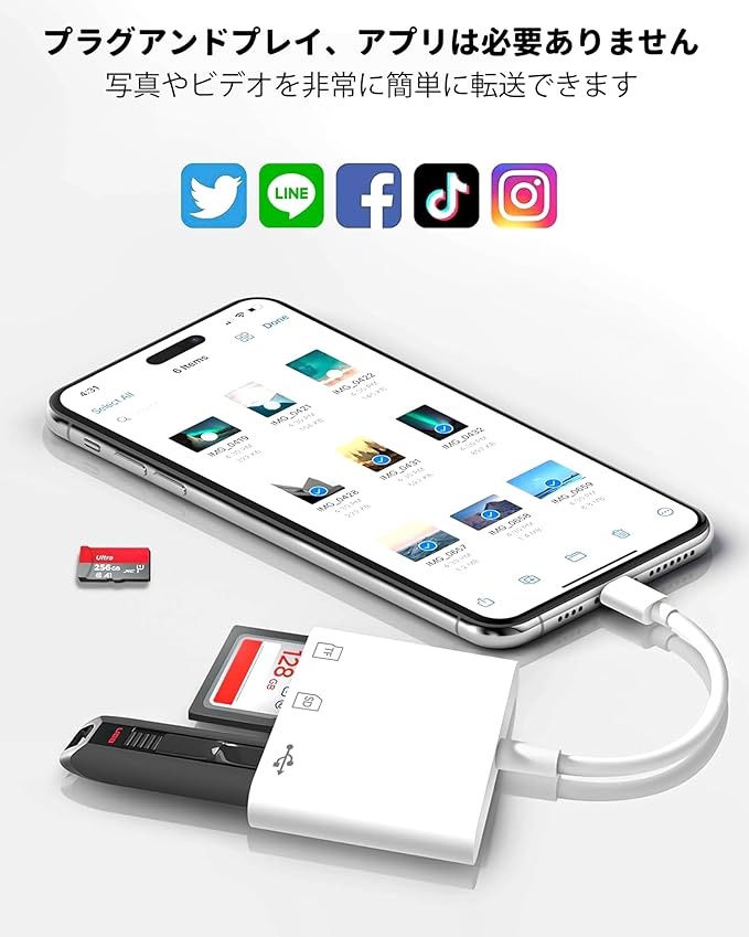 【3 機能一体型 大容量データ管理】 「sd カードリーダー」は SD/TF カードポートと USB ポートを搭載。iPhone や Type-C デバイスに接続して、写真、動画、ドキュメントを簡単に読み取り・書き込み可能。専用アプリを使って双方向データ転送ができ、「iphone sd カードリーダー」でストレージ不足を解消!