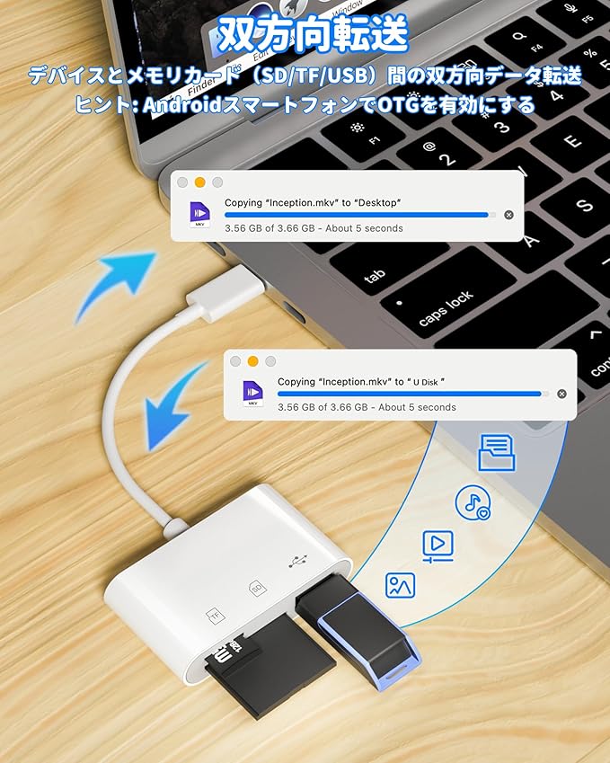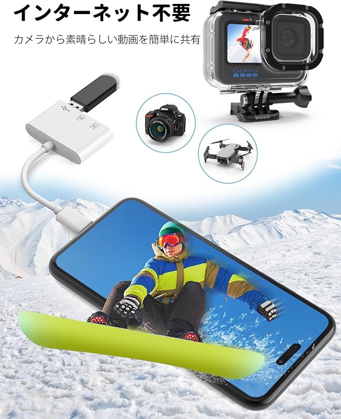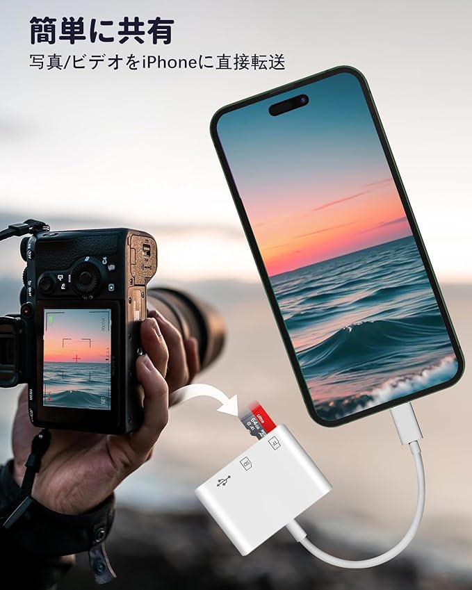 【OTG 機能搭載 即時接続】 「sd カードリーダー タイプ c」は USB OTG 機能で、PC 不要で直接 SD/TF カードのデータにアクセスできます。専用アプリやインターネット不要で、カメラの写真をスマホにすぐ転送できます。プラグ&プレイで、使い勝手抜群の「sd カードリーダー USBC」です。