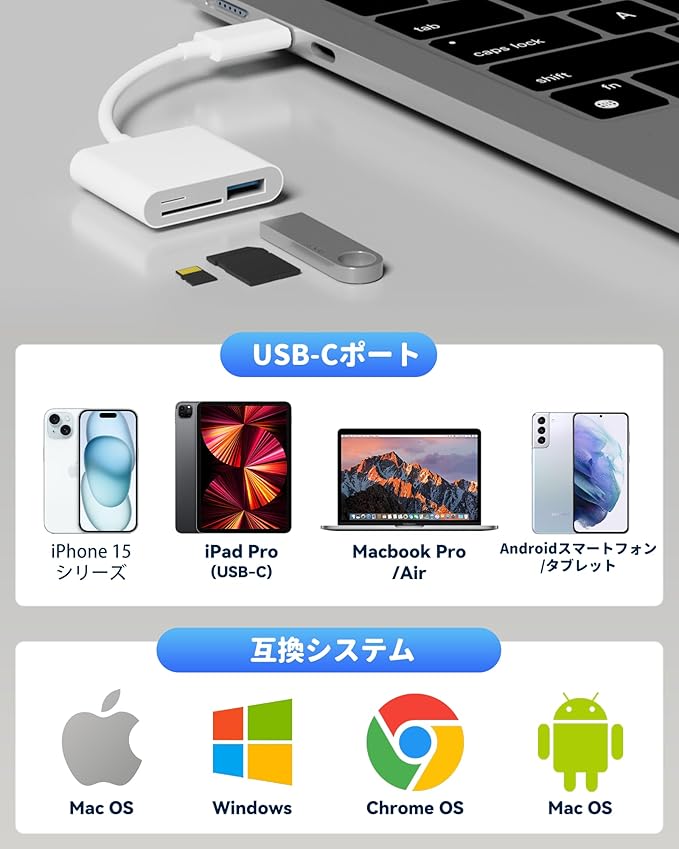 【幅広い互換性 多機種対応】 Windows/Mac/Linux/Android など、Type-C ポート搭載のデバイスに対応。iPhone15/16 や iPad Pro、MacBook シリーズ、さまざまな Android スマホにも使えます。「sd カードリーダー USBC」で、様々な機器間でのデータ共有が簡単に!