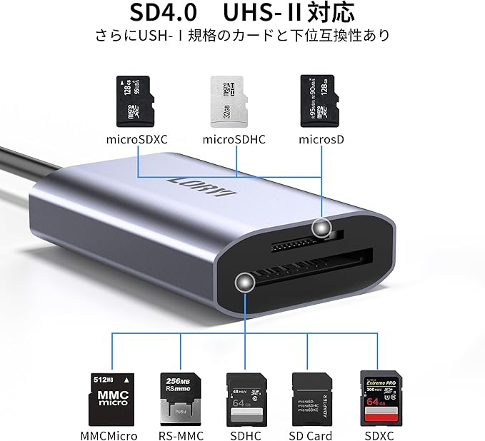 【SD 4.0カードリーダー】Loryi USB C to SD/TF 4.0カードリーダーは、最大312MB/sの高速転送速度で、UHS-II SD/Micro SD(TF) 4.0標準をサポートしています。これは3.0よりも3倍速いです。また、UHS-I SD/Micro SD(TF) 3.0との後方互換性もあり、ファイルやビデオを瞬時に転送することができます。