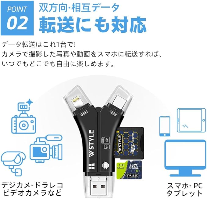 スマホ SD カードリーダー SDカードカメラリーダー 専用アプリ不要で簡単 1TB 対応 iPhone16 USBメモリ 外付け 写真 保存 移動 容量 データ バックアップ 日本語取説付 W STYLE 正規品 (DN063_white+128GB)