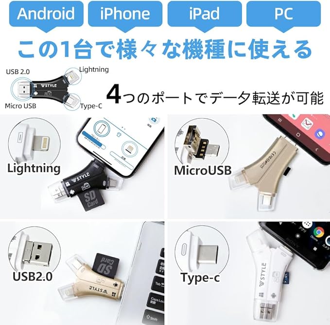 特徴 4in1多機能カードリーダー。 IOS、Type-C、USB、Micro USBの4種類のコネクタを搭載し, コンパクト, 専用アプリ不要で簡単