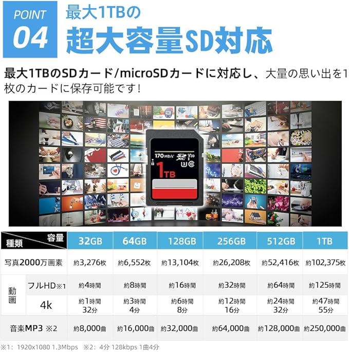 【TF/SDカード対応】 最大1TBのSDカード/microSDカードに対応し、大量の思い出を1枚のカードに保存可能です!
