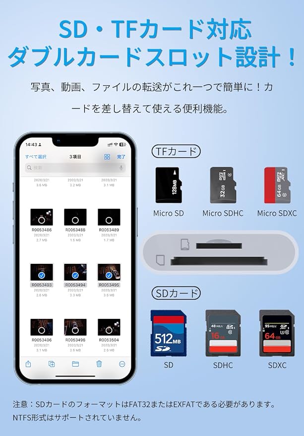 【幅広い互換性】iOS 9.2以降のデバイスに対応しており、iPhone14/14 Pro/14 Pro Max/13/13 Mini/13 Pro/13 Pro Max/12/12 Mini/12 Pro/12 Pro Max/11/11 Pro/11 Pro Max/Xs/Xs Max/iPad Pro/Air/Miniなどに使用できます。(注意:カードを挿入後、約5秒程度の反応時間がかかります。もしファイルが表示されない場合は、カードを再度挿し直してください。)