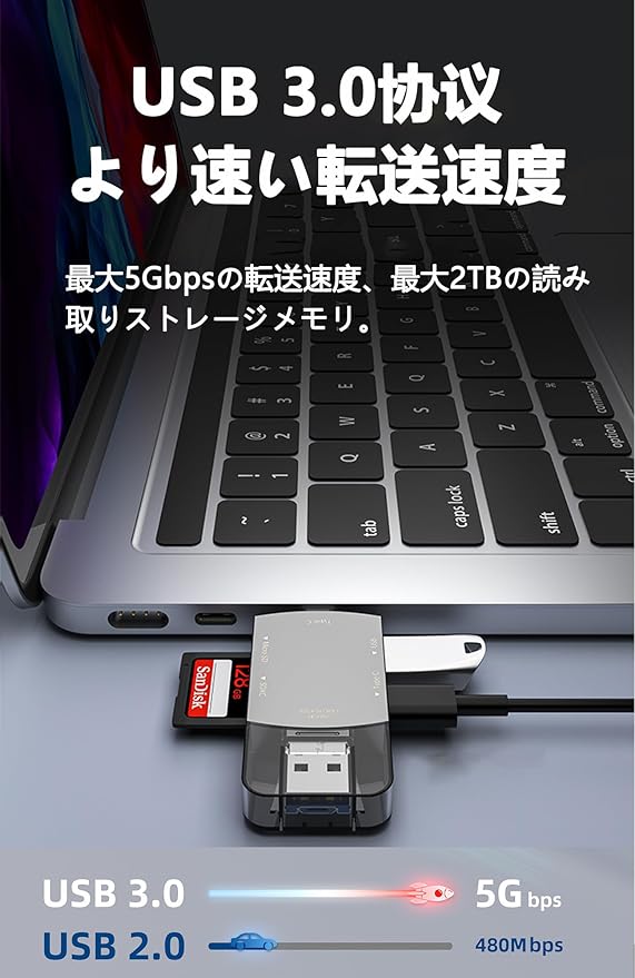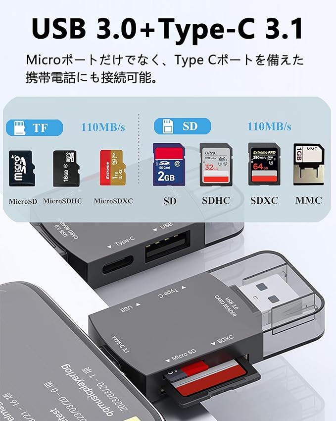 【4-in1カードリーダー】: USB 3.0+Type-C 3.0+Micro Bの2種類の端子を組み合わせで多機能SD/TF/USBカードリーダーで、PC、OTG機能対応タブレット、Androidスマートフォンでのデータ転送に最適です, 最速5Gbpsの伝送速度。この4 in 1 SDカードリーダーは、1つのSDカードポート(SD / SDHC / SDXC / RS-MMC / MMC- Microカード)、1つのTFカードポート(Micro SD / Micro SDHC / Micro SDXCカード)、および1つのUSBポートをサポートします(USB 3.0)+および1つのUSBポートをサポートします(Type C 2.0)。OTGデバイスに対応します。最大可读写 2T 存储卡。
