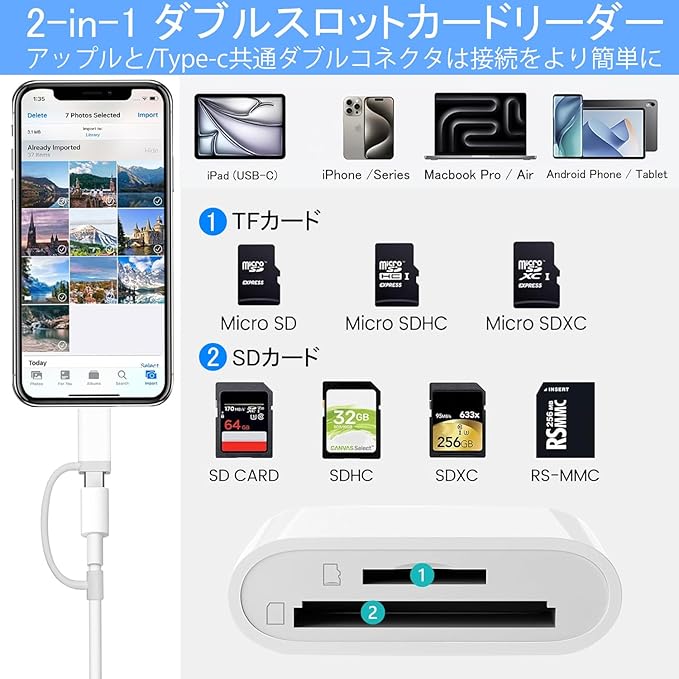 SDカードリーダー カードリーダーライトニング 2in1 type-c カードリーダー USB3.0 OTG機能 双方向高速データ転送 高精細写真動画/音声ファイル/4Kビデオ 読み込みWord/Excle/PPT/PDF設定不要 i-phone/i-pad/IOS/Windows/Android