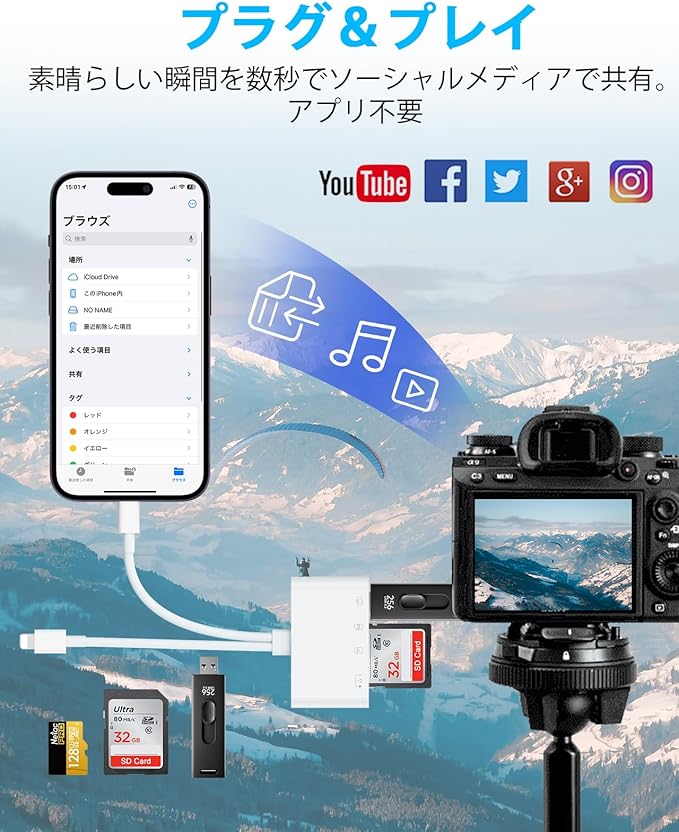 【プラグアンドプレイ、同時読み書き】PC/WIFI/Bluetooth/ダウンロードは不要。iOS標準の[ファイル]アプリからデータ転送。2台のUSBフラッシュドライブとメモリーカードの同時読み書きをサポート。 注:SDカードとTFカードは同時に読み書きできません。