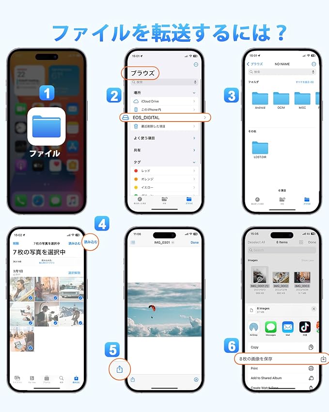 【4in1 iPhone SD カードリーダー】ライトニング sdカードリーダーは最新の2024 MFI認証チップを搭載し、4種類のポート(①SDカードポート、②microSDカードポート、③フル機能Type-Cポート、④USB3.0ポート)を備えている。一般的な用途:カメラの写真転送、機種変更時のデータ転送、ファイルの保存、他の周辺機器とのUSB使用、音楽鑑賞など。