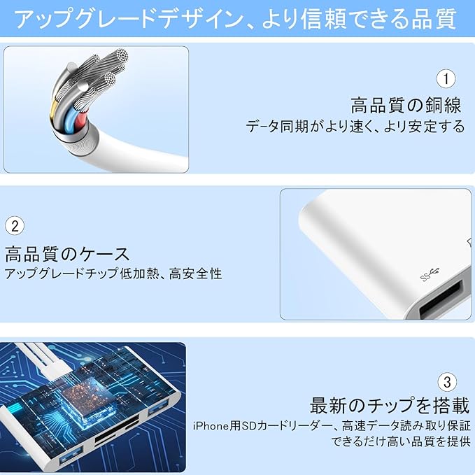 【幅広い互換性】このライトニング sdカードリーダーには、USB C、Light-ning、USB Aインターフェイスを持つすべてのデバイスをサポートし、通常のカードリーダーよりも互換性が向上している。i-Phone 17/16/15/14/13/13 Mini/13 Pro/13 Pro Max/12/12 Mini/12 Pro/12 Pro Max/11/11 Pro/11 Pro Max/Xs/Xs Max/Pad Pro/Air/Mini/などに対応。USB-Cポートを備えたi-phone 15、i-Pad Pro、Macbook、iMac、Google Pixel、 Dell XPSなどのPCと互換性があり、OTG機能付きの Androidスマホ、タブレットにも対応しています。タブレットからusbアダプタまで標準の写真フォーマットやJPER、RAW、SD、hdビデオフォーマットに対応しています。カメラ、キーボード、USBメモリ、カードリーダーなど、USB周辺機器を接続することもできます。