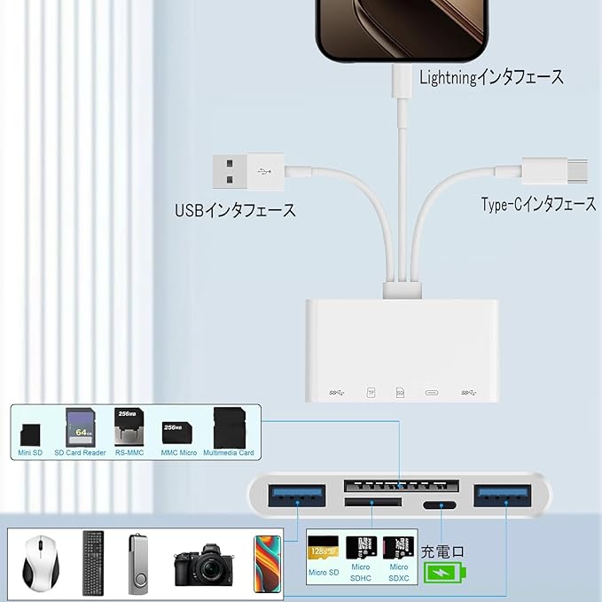 【5in3 カードリーダー】カードリーダーの3本のケーブル(ライトニング/Type-C/USBケーブル)は、あらゆる携帯電話/Pad/Android/PCデバイスで使用できる。SDカードポート(SD / SDHC / SDXC / RS-MMC / MMC- Microカード)+TFカードポート(Micro SD / Micro SDHC / Micro SDXCカード)+ライトニング充電ポート+USB 3.0ポート*2。専用アプリやインターネット不要でデータ通信制限を気にすることなく、カードリーダーを接続するだけで、簡単にデジタルカメラで撮影した写真をスマホに転送できます。