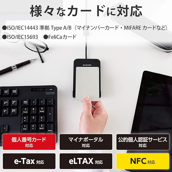 公的個人認証サービスに対応しており、マイナポータル、e-Tax、eLTAXなどのご利用が可能です。
