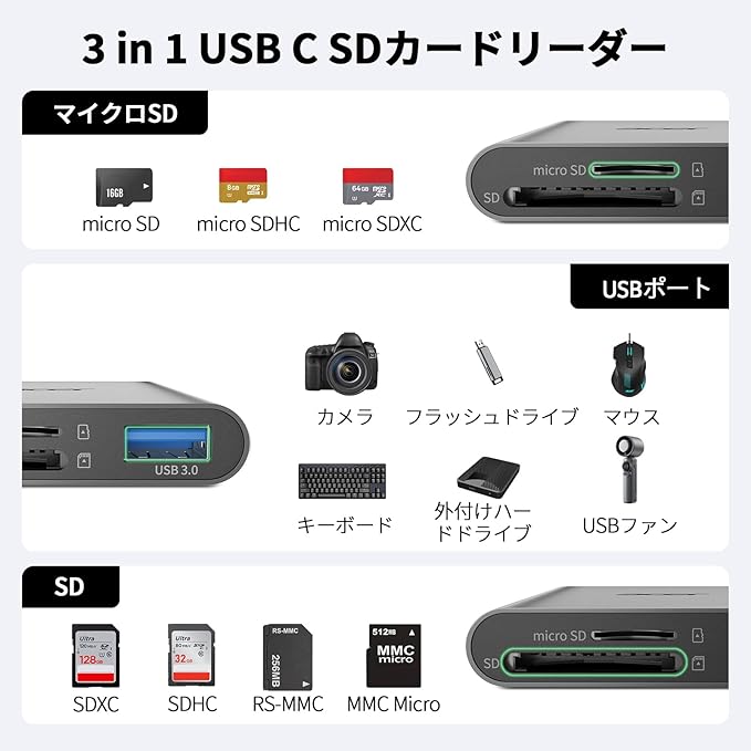 Acer SDカードリーダー タイプC【3-in-1】USB C MicroSDカードリーダー [USB 3.0ポート搭載] 超高速転送 OTG、USBC to USBA変換コネクタ アダプター、マウス・キーボード対応 ノートパソコン/タブレット/スマートフォン/iPhone 16・15対応