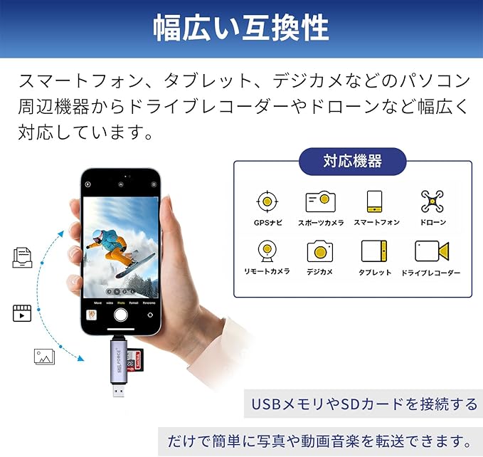 【USB-A/USB-C カードリーダー】USB-AまたはUSB-CのPC、スマートフォン、タブレットに対応。本製品にSDカード等を差し込み、対応のデバイスと接続するだけで簡単に写真や動画、音楽などのデータを転送します。SD、SDHC、SDXC、MMC micro、RS-MMC、microSD、microSDXC、microSDHC、容量2TBのカードまで使用可能。コンパクトサイズで持ち運びにも便利です。