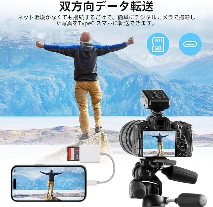 【sdカードリーダー】sdカードリーダーは、iPad PRO、iPad mini、iPad Air、iPhone 15シリーズ、Samsung、Google、HUAWEI、SONY、XIAOMI、MOTO、まだはLaptop book(Windows, Android, Mac OS)など、さまざまなUSB-C端子を備えたデバイスに対応(OTG機能を使用する必要があります)。sdカードリーダー タイプcを使えば、カメラの画像や動画をいつでもどこでも簡単にソーシャルメディアにシェアできます。sdカードリーダー タイプcは、特に動画ブロガーやフォトグラファーに最適な高性能リーダーです。(ご注意:Lightning端子には対応していません)