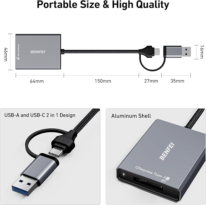 BENFEI CFexpress タイプA カードリーダー, USB 3.2 (Gen 2) 10Gbps, USB-C&USB-A 2-in-1 Type A CFexpress アダプタ Windows/Mac/Linux/Android
