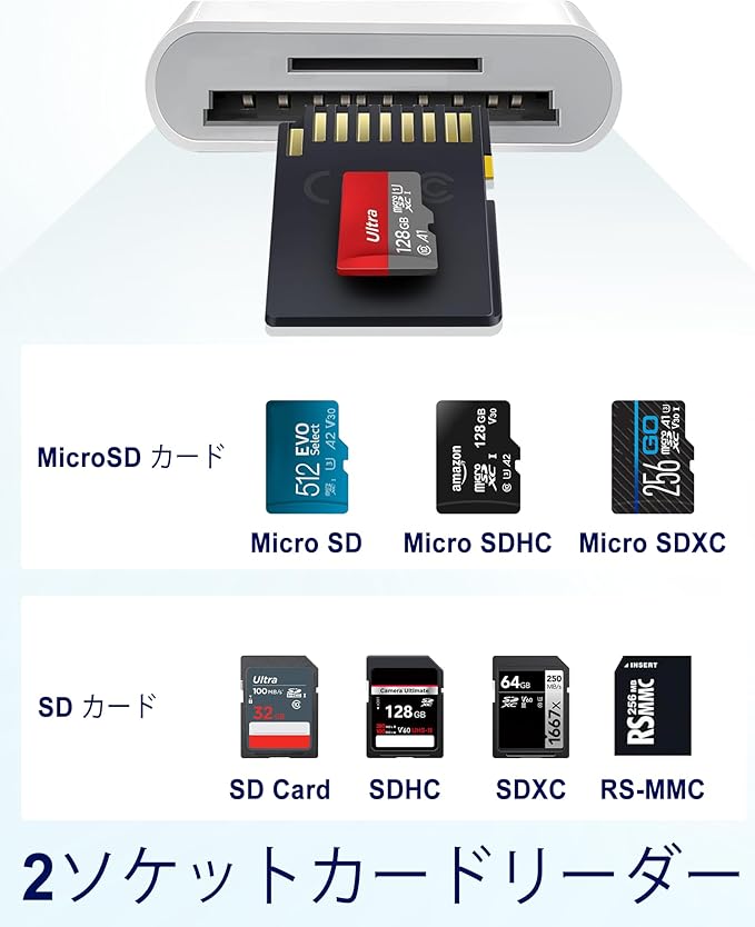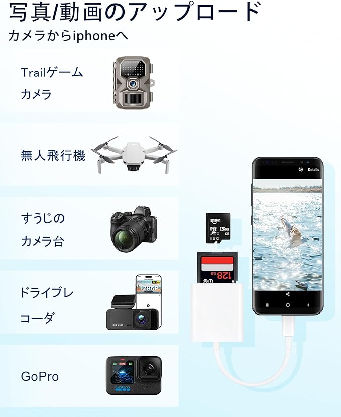 優れた互換性: このiPhone SDカードリーダーは、iPhone 14/14 pro/14 Pro Max/13/13 Mini/13 Pro/13 Pro Max/12/12 Mini/12 Pro/12 Pro Max/11/11 Pro/11 Pro Max/Xs/Xs Max/se と互換性のある1つのSDカードポート(SD/SDHC/SDXC/RS-MMC/MMC-Microカード)と1つのTFカードポート(マイクロSD/マイクロSDHC/マイクロSDXCカード)を備えています。Mini/13 Pro/13 Pro Max/12 Mini/12/12 Pro/12 Pro Max/11/XR/XS/X/8/7/6/5、Canon、Nikon、iPadおよびその他のデバイス。8GB/16GB/32GB/64GB/128GB/256GB/512GB の SD/SDHC/SDXC カードに対応しており、Micro SD アダプタ付きの Micro SD カードもサポートしています。最大512GBのメモリーカードに対応。