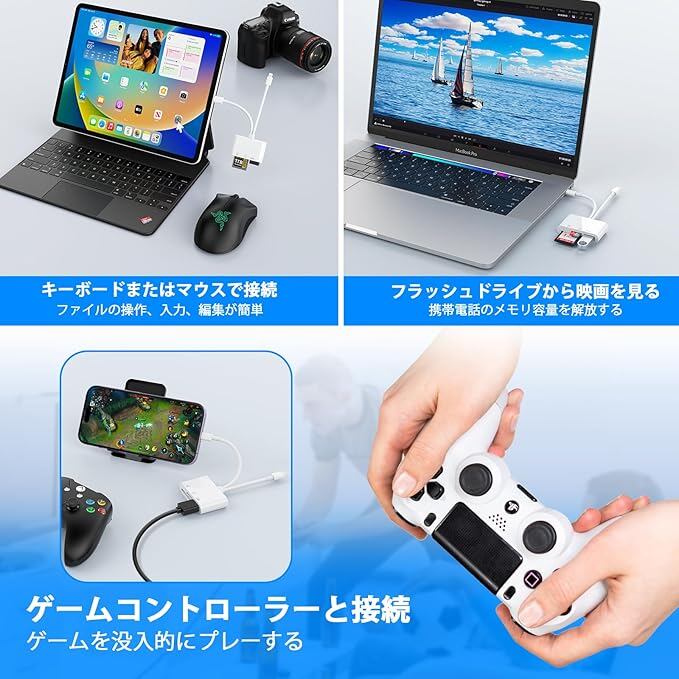 【2025最新 sd カードリーダー】この3in1 USB C / iPhone/iPad SDカードリーダーには、1つのSDカードポート(SD/SDHC/SDXC/RS-MMMC/MMMC-Micro)、1つのTFカードポート(マイクロSD/マイクロSDHC/マイクロSDXC)、および1つのUSBポートがあります。お手持ちのSD、microSDカードをカードリーダー差し込んでスマホ本体に接続するだけで使えます。アプリのインストールなどが不要で、簡単に使えます。SDカードから直接携帯電話に写真やビデオを簡単にダウンロードできます