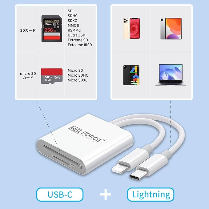 【2in1 SDカードリーダー】USB-C/LightningのiPhone、PC、スマートフォン、タブレットなどに対応しています。本製品にSDカードやmicroSDカードを差し込み、デバイスと接続するだけで簡単に写真や動画、音楽などのデータを転送できます。コンパクトサイズで持ち運びにも便利です。