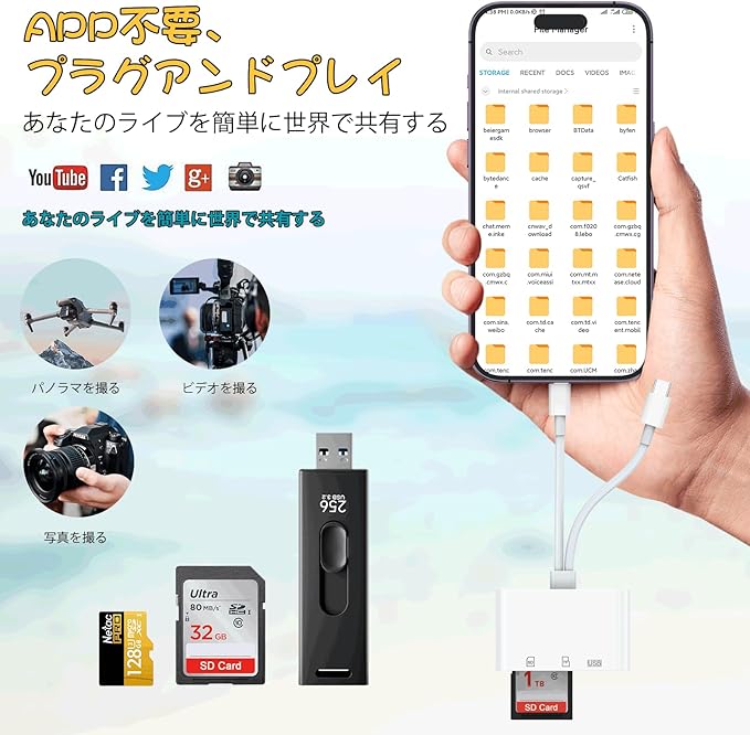 【3イン2SDカードリーダー】USB 3.0ポート x 1 + SDポート (SD/SDHC/SDXC/MMC/RS-MMC) + TFポート (Micro SD/Micro SDHC/Micro SDXC) x 1 + Lightningポート + Type-Cポート 写真、ビデオ、ファイルをいつでもどこでも共有できます。 携帯電話の容量不足や写真がたくさんあることを心配する必要はありません。 最大512GBのTF/SD/USBに対応。