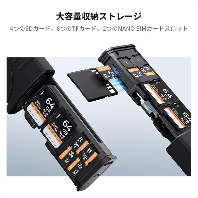 収納機能:SDカード/TFカード用の12スロット搭載で、大切なメモリーカードを整理。コンパクトなデザインで、旅行や外出先でも簡単に持ち運べます。カメラバッグやポケットに収めやすく、必要なときにすぐに取り出せる便利さがあります。