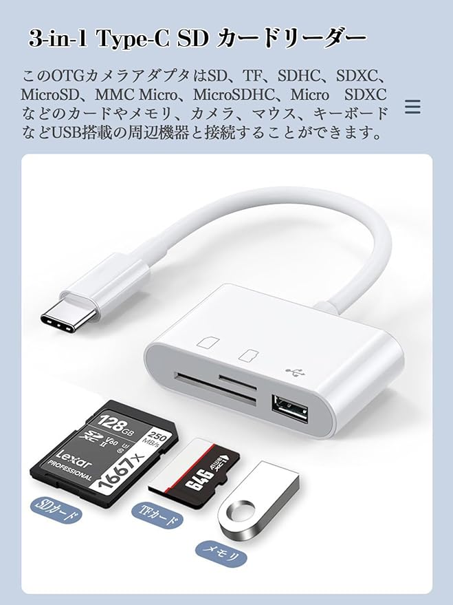 【3-in-1カードリーダー】この3in1カードリーダーは、USB Type-Cポートを搭載した機器向けのOTGアダプターです。1台でUSB Type-A、SDカード、microSDカード(TFカード)の3種類のスロットを利用でき、対応するメディアからのデータ転送が可能です。