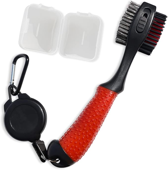 ゴルフクラブブラシ 清潔用 メンテナンスツール ワイヤ ナイロン 針収納可 三面 伸ばせるひも カラビナフック付き 滑り止めゴムのハンドル 携帯便利 軽量 多用途 レッド