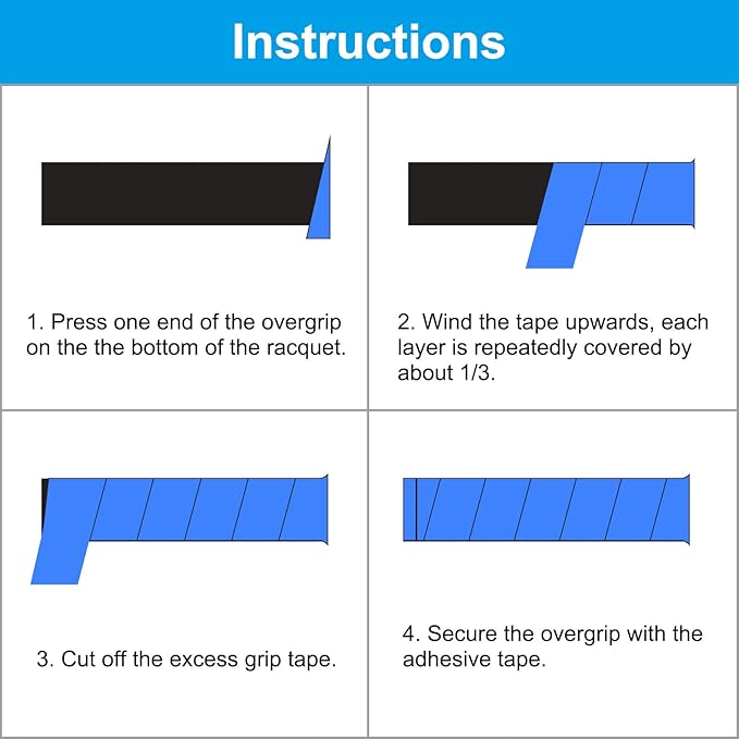 説明: 1. ラケットの底の側面にあるグリップテープの一方の端を押します。2. テープを上向きに巻き、各層の端を繰り返し約1/3ずつ覆います。3. 余分なグリップテープを切り取り、付属の粘着テープで上部を固定します。