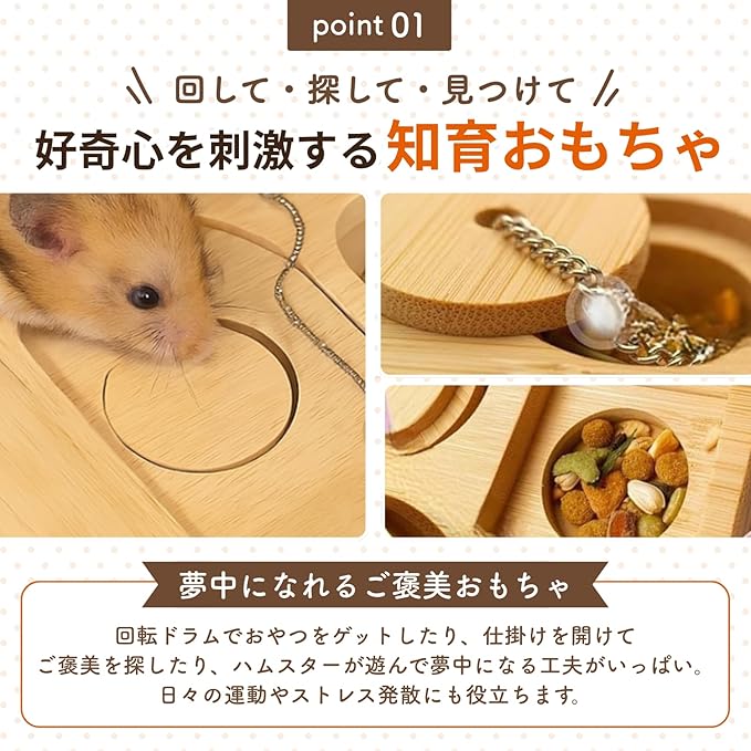 ハムスター 知育 おもちゃ 餌 入れ 木製 回転式 ペット 餌やり おやつ 小動物 玩具 回す 遊ぶ (天然素材, 知育)