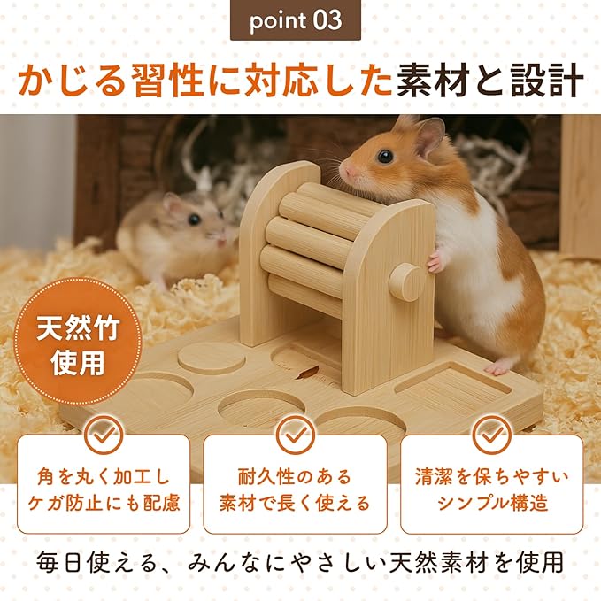 竹素材を採用した丁寧な仕上げと優しい質感:全体に自然由来の竹素材を使用し、滑らかに加工された表面はペットの足や歯にもやさしく触れるよう設計されています。角が丸く仕上げられているため、使用中に不快感を与えにくく、見た目の上質さと扱いやすさを両立しています。木のぬくもりが感じられる素材感は、ケージ内の雰囲気にも調和しやすく、落ち着いた空間づくりに貢献。かじったり乗ったりといった動作にも耐えやすく、長く楽しめるつくりです。着色や塗装を行わず、素材本来の風合いを活かして仕上げられているため、ペットの体にもやさしく配慮された構造になっています。組み立て部分も精密で、ぐらつきにくい安定感のある仕様。小動物が活発に遊ぶ環境にも適しています。機能性と見た目のバランスがとれた知育用の木製トイです。
